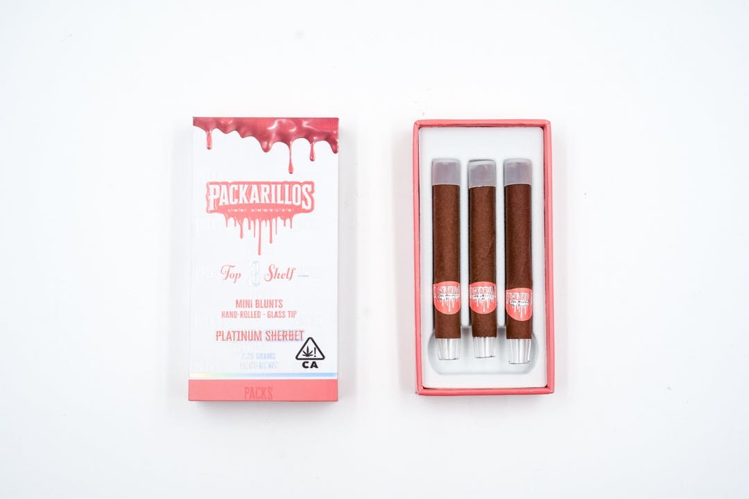 Packwoods Packarillos Platinum Sherbert besteht aus 3 MINIS – jeweils 0,75 Gramm Premium-Blüten, konstruierter Kreuzschliff-Glasfilter in einer langsam brennenden, 100 % tabakfreien Hülle.