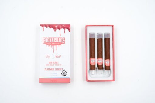 Packwoods Packarillos Platinum Sherbert besteht aus 3 MINIS – jeweils 0,75 Gramm Premium-Blüten, konstruierter Kreuzschliff-Glasfilter in einer langsam brennenden, 100 % tabakfreien Hülle.